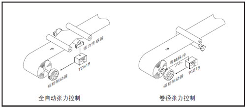 TC818可以設置為全自動張力控制器或卷徑張力控制器,當功能選擇[29][1]設置為自動張力控制時,TC818為全自動張力拉制器,需安裝張力傳感器,組成閉環控制系統。當功能選擇[29]設置為卷徑張力控制時,TC818為卷徑張力控制器,只需安裝接近開關/編碼器對料卷半徑進行測量,控制器根據卷徑張力控制。