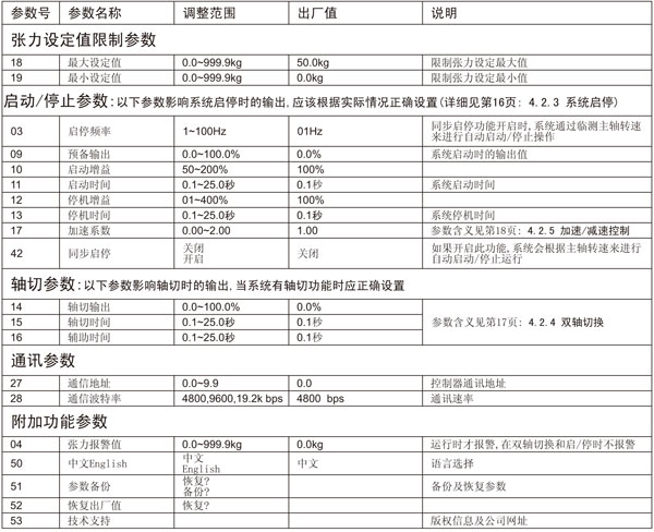 為了使控制器能正確測量卷料張力,必須對與張力測量相關的參數進行正確的設置: