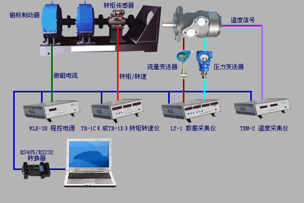- 系統通過1臺相位差式轉矩轉速傳感器及1臺TR-1C轉矩轉速采集儀(或TR-1D轉矩轉速采集儀)采集馬達的輸出轉矩和轉速;用1臺LY-1型數據采集儀采集流量和壓力;用1臺TEM-2溫度采集儀檢測溫升;用WLK-3B程控電源控制磁粉制動器對馬達進行加載。